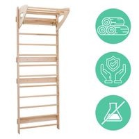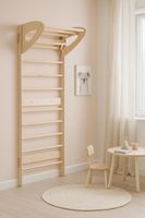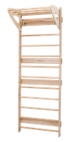 Absolutna łatwość montażu zestawu. Tata poradzi sobie z nim sam! Dostarczane drabinki są w formie złożonej, jako dwie zmontowane półdrabinki gotowe do nałożenia jedna na drugą. Forma konstruktora pozwala dołożyć dodatkowe elementy typu lina, koła gimnastyczne czy huśtawka. Osoby, które nie mogą się zdecydować gdzie taki zestaw zamontować – zawsze mogą wybrać wersję montowaną rozporowo między sufitem i podłogą, co nie wymaga wiercenia otworów w ścianie i pozwoli w przyszłości bezproblemowo przenieść drabinkę na nowe miejsce. Wersja rozporowa także dopasowuje się do wysokości mieszkania. Najmniejszy zestaw zajmuje zaledwie około 0,6 m2. Nasz zestaw Kometa-1 z powodzeniem został zamontowany w pokoju o powierzchni 10,5 m2.